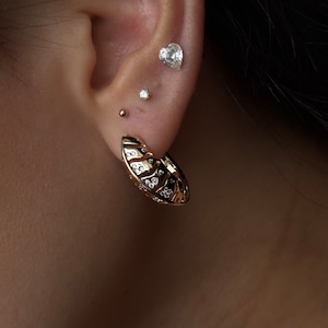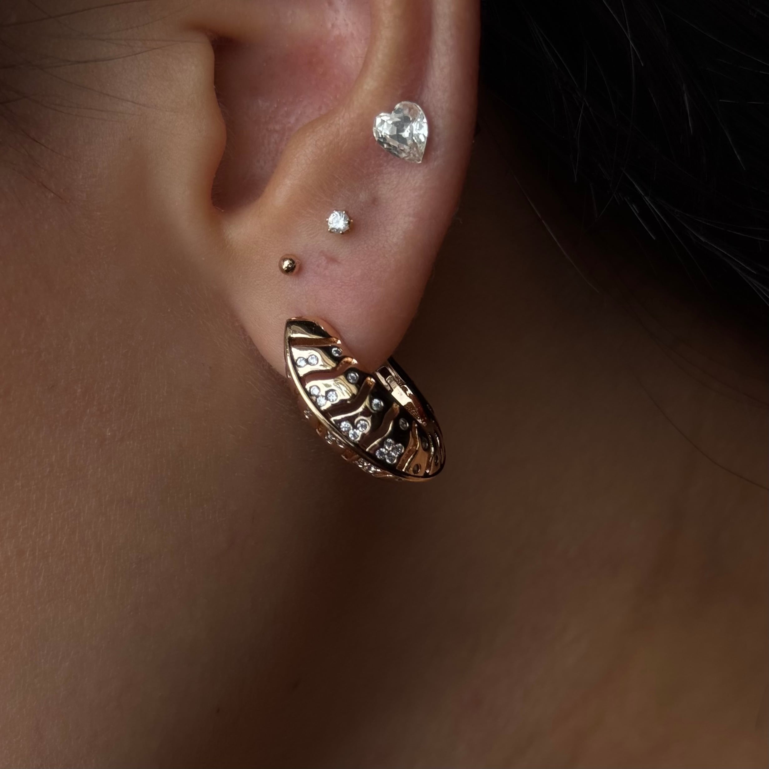 他にはないぼってりとした存在感がありながら、驚くほど軽やか。18Kコーティングの艶めきとジルコニアの輝きが、耳元でモダンな印象を放ち、特別な日にも日常にも華を添えます。