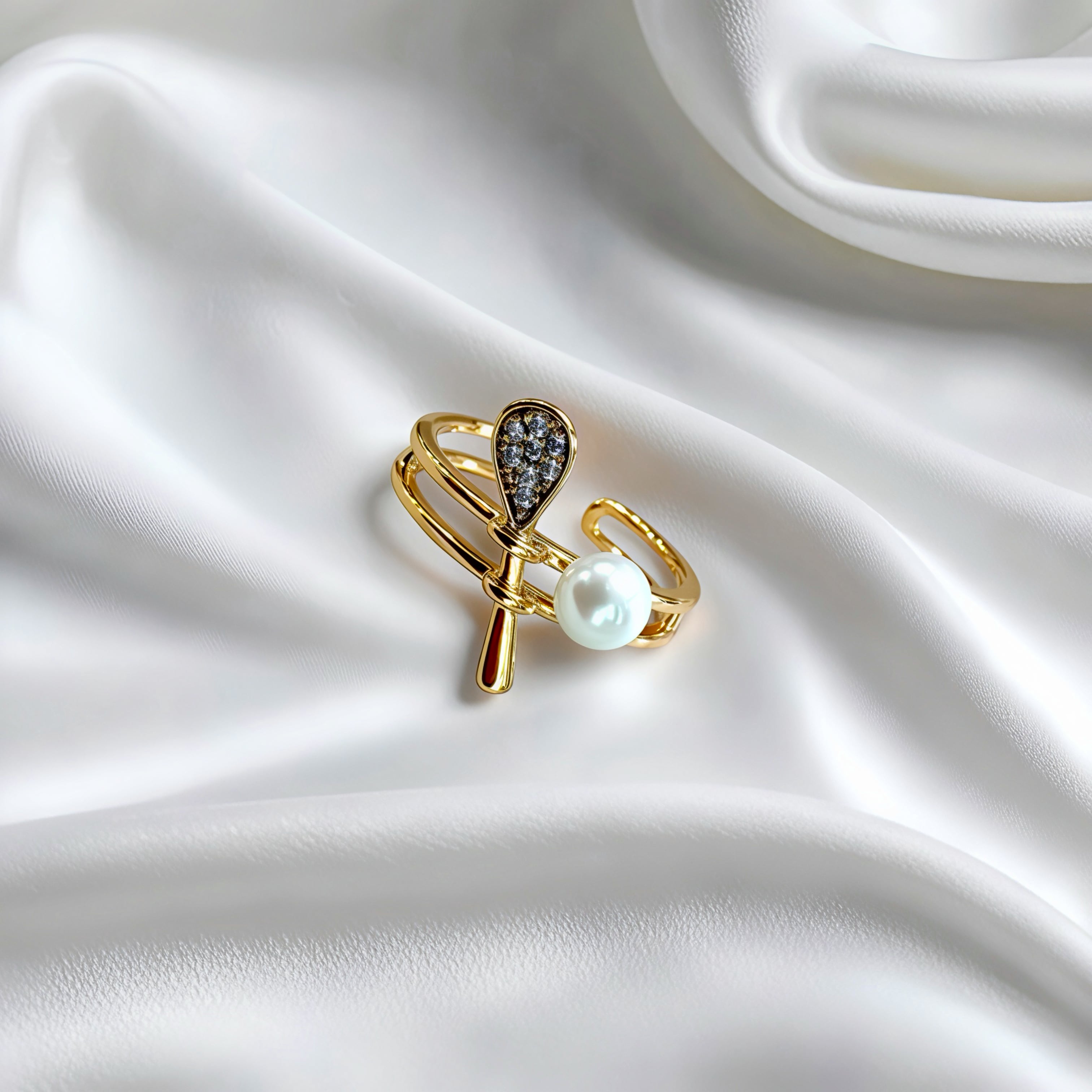 片側にパール、もう片側にジルコニアを敷き詰めたティアドロップ型のモチーフが輝く、繊細なオープンリング。