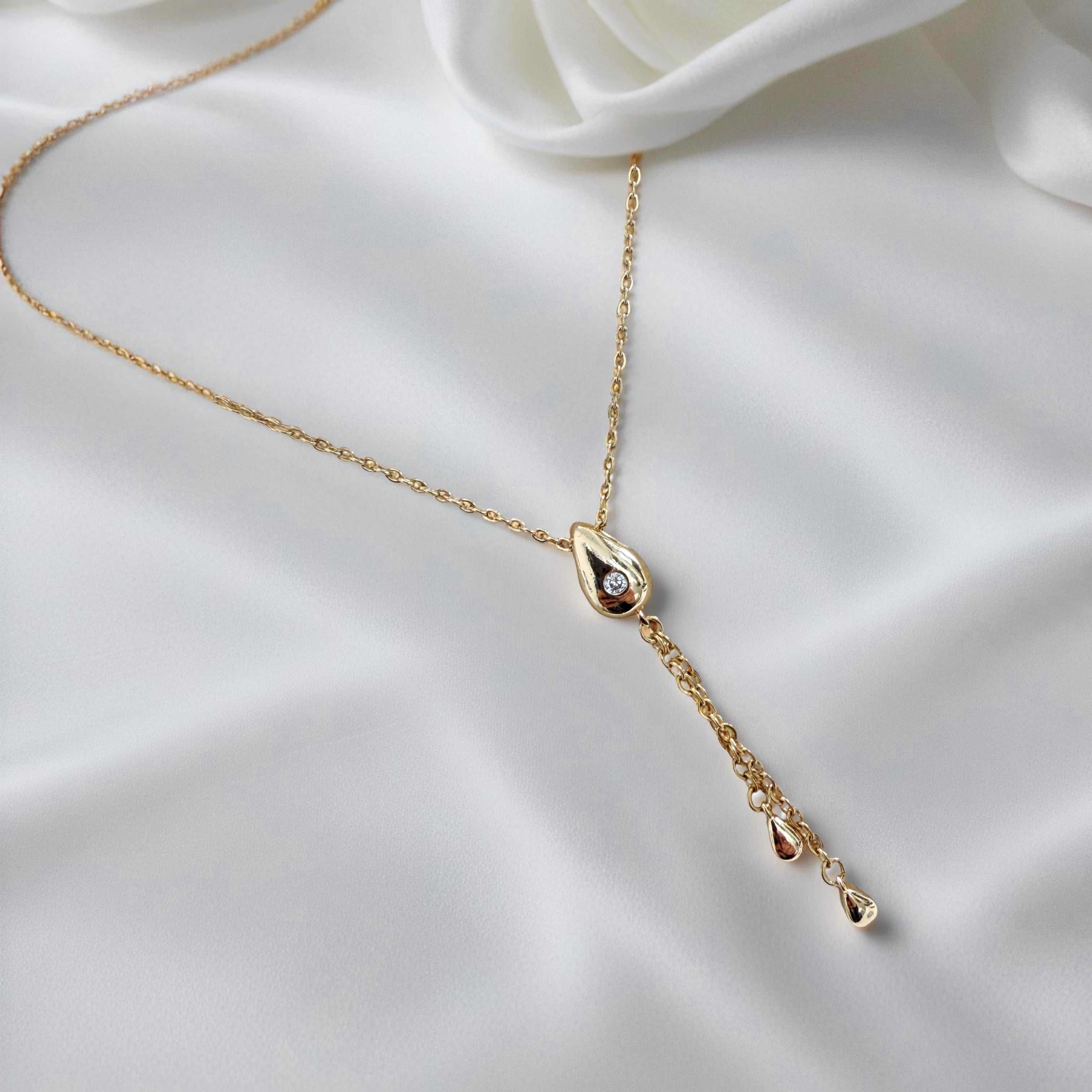 しずく型のクリスタルを中心に、繊細なチェーンが2本垂れる立体的なデザインのネックレス。