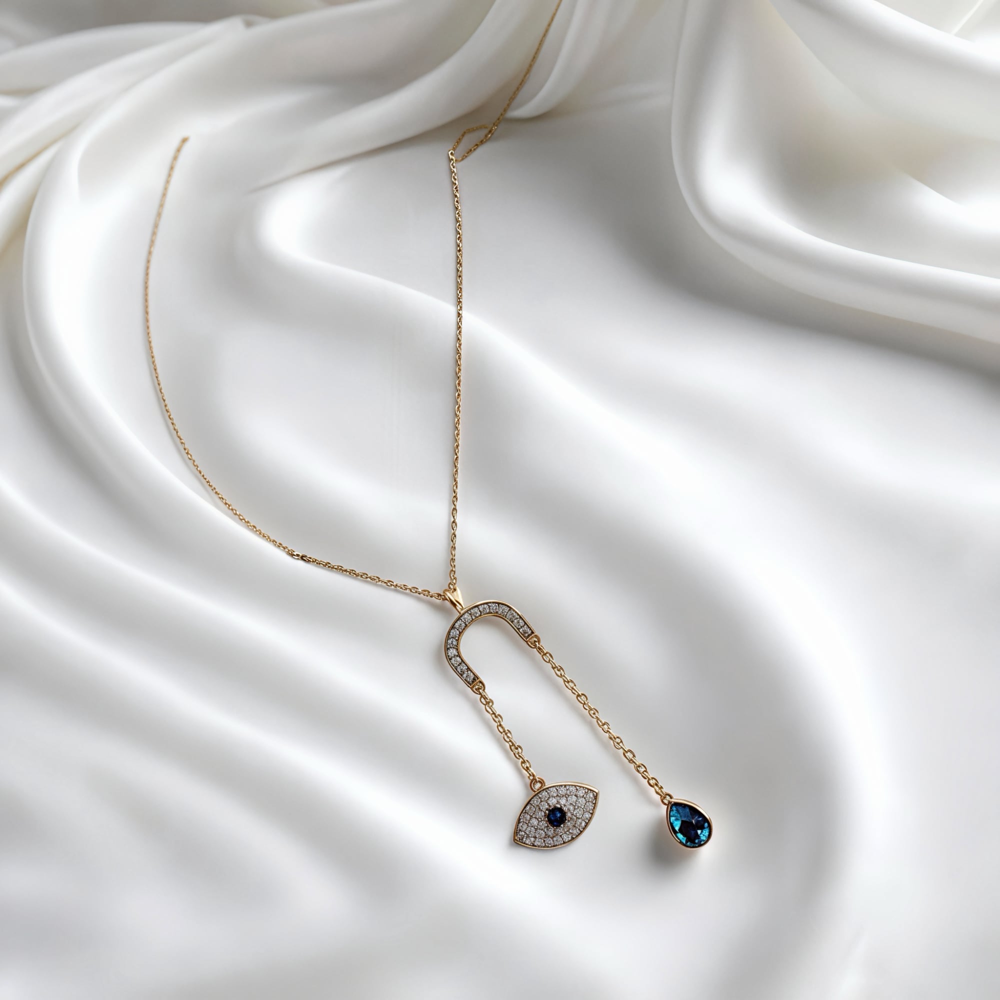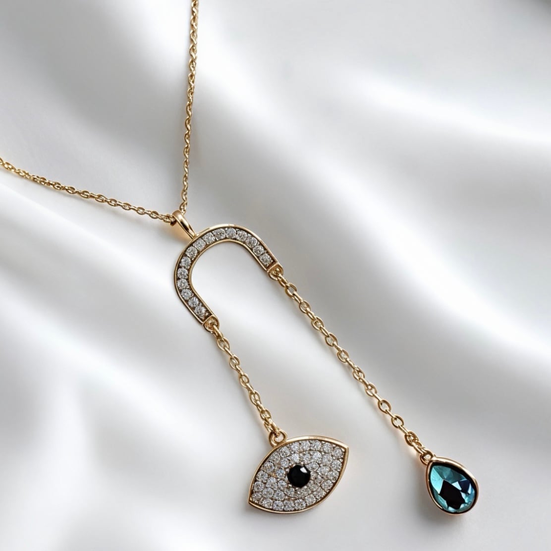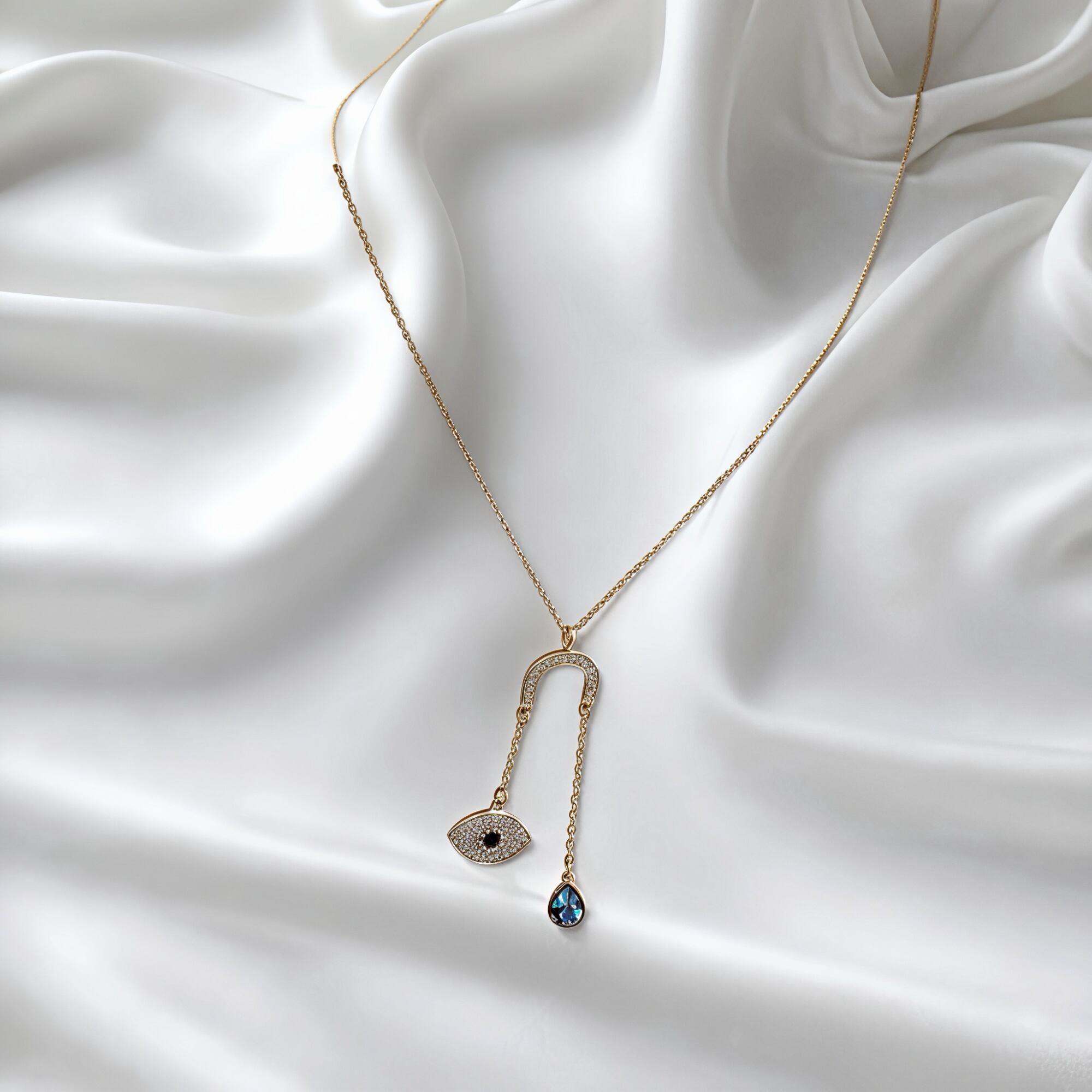 目のモチーフとしずく型チャームが並ぶ、シンボリックなデザインのネックレス。