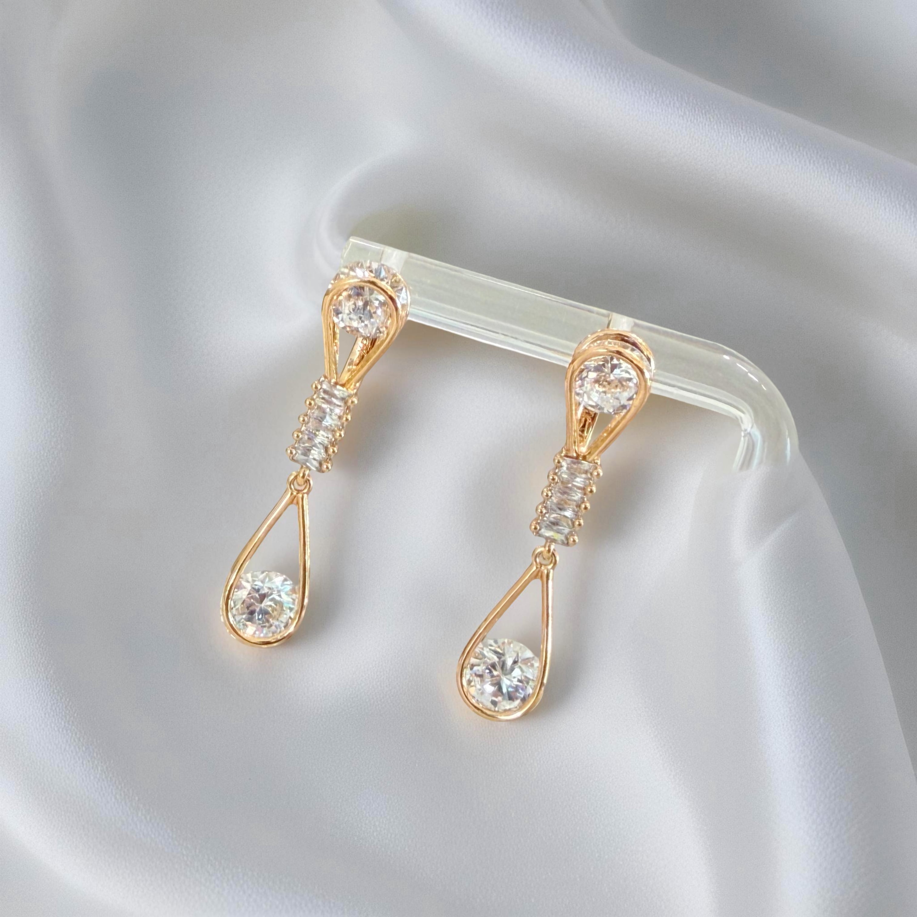 デザイン 溶けたガラスのしずくを思わせるフォルム、バゲット&ラウンドカットの石、縦長でエレガントな印象