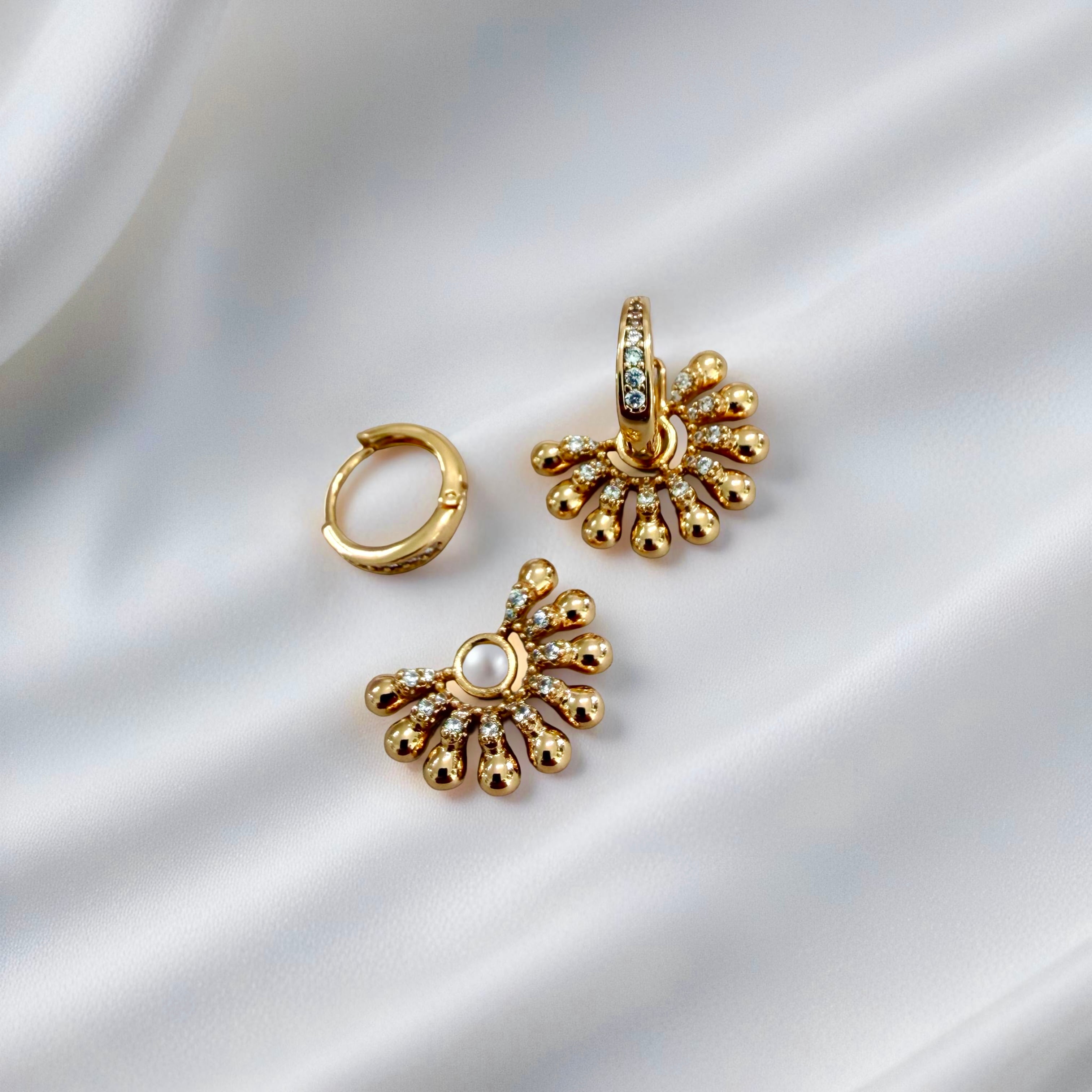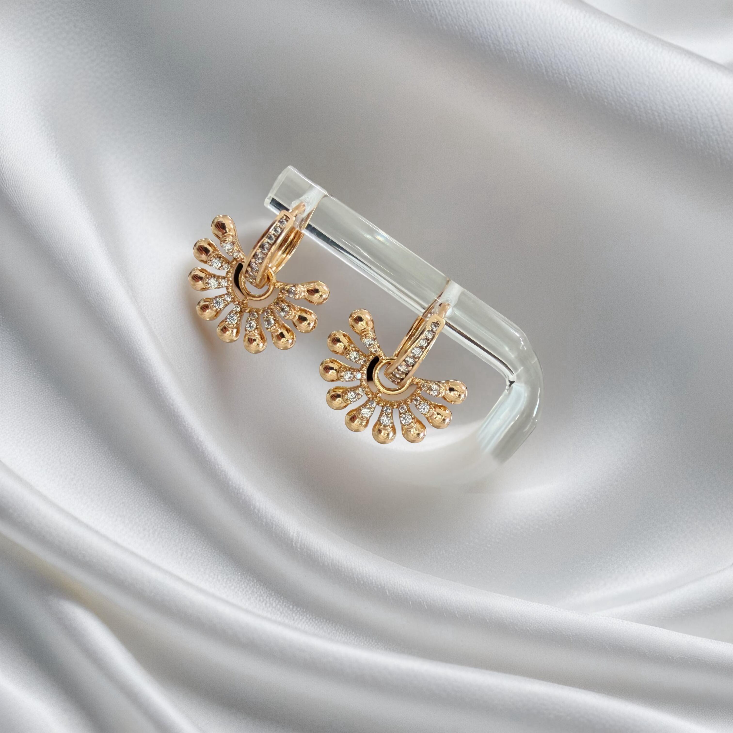 中央の小さなフープ(約1.0cm)から、ジルコニアが敷き詰められた放射状のチャーム(約1.5cm)が広がり、動くたびに繊細な輝きを放ちます。