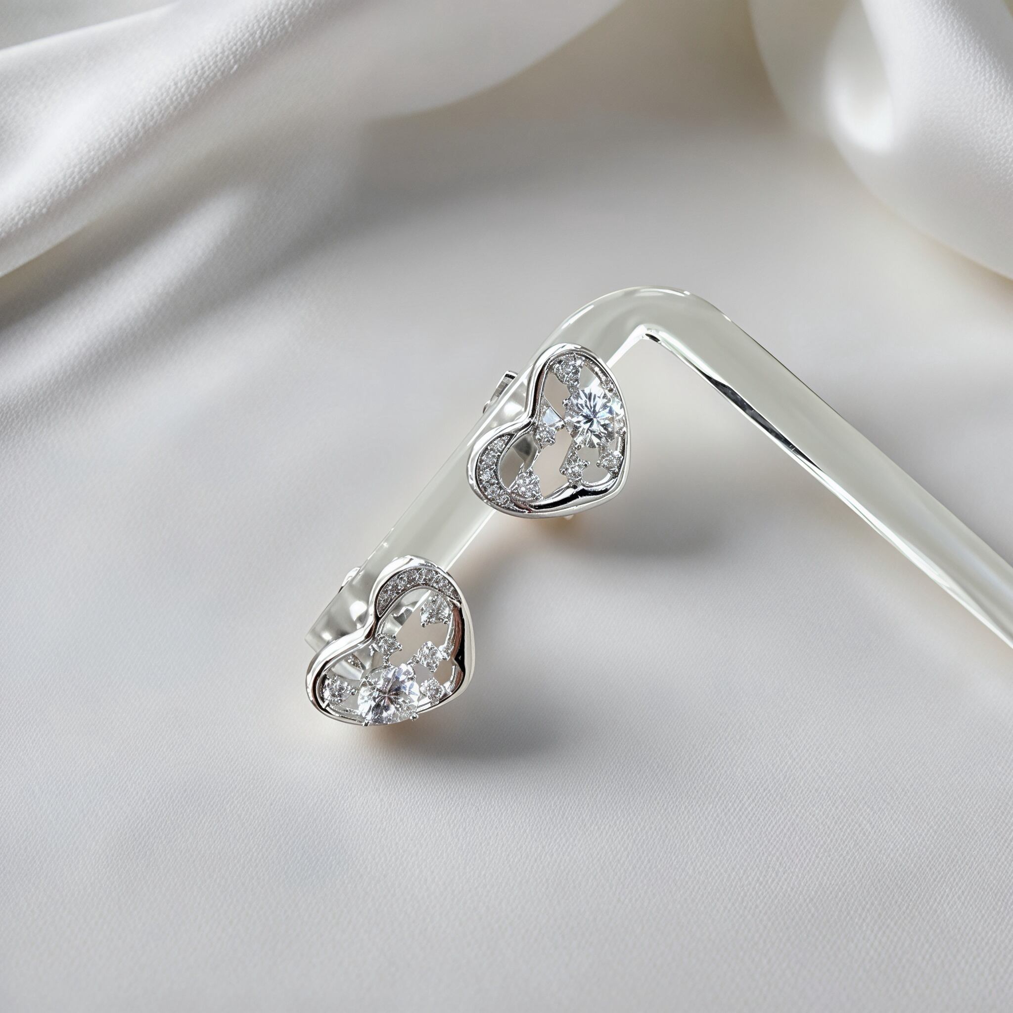 ハート型のフォルムにジルコニアが繊細に敷き詰められた、可憐でロマンティックなピアス。