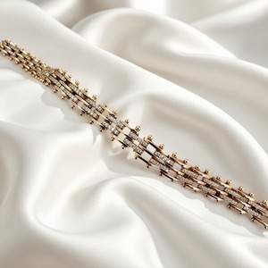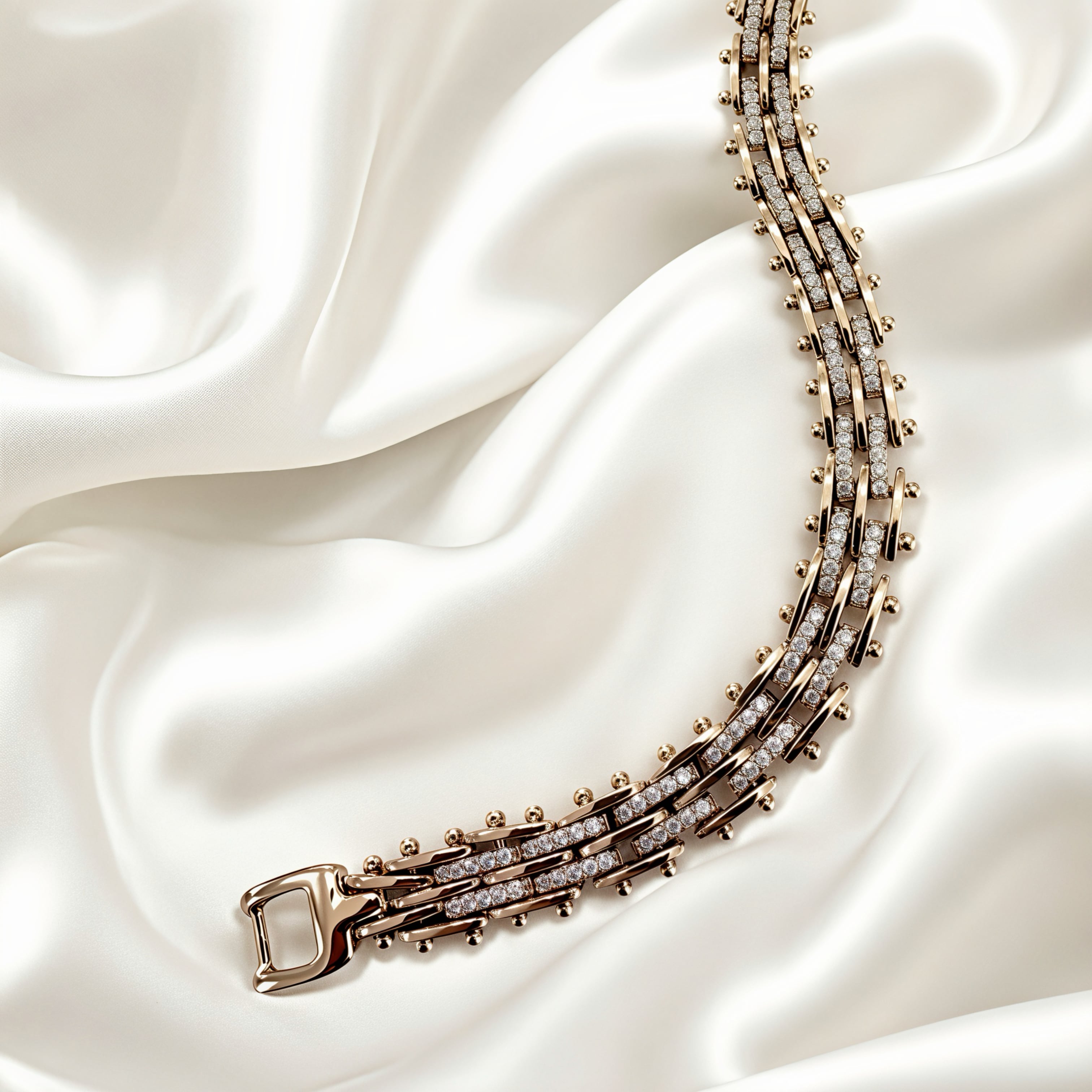 ローズゴールドのリンクにジルコニアが繊細に敷き詰められた、18Kゴールドコーティングのラグジュアリーブレスレット。