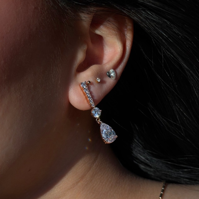 先端には雫型のキュービックジルコニアが揺れ、動くたびに光を反射して耳元を美しく彩ります。