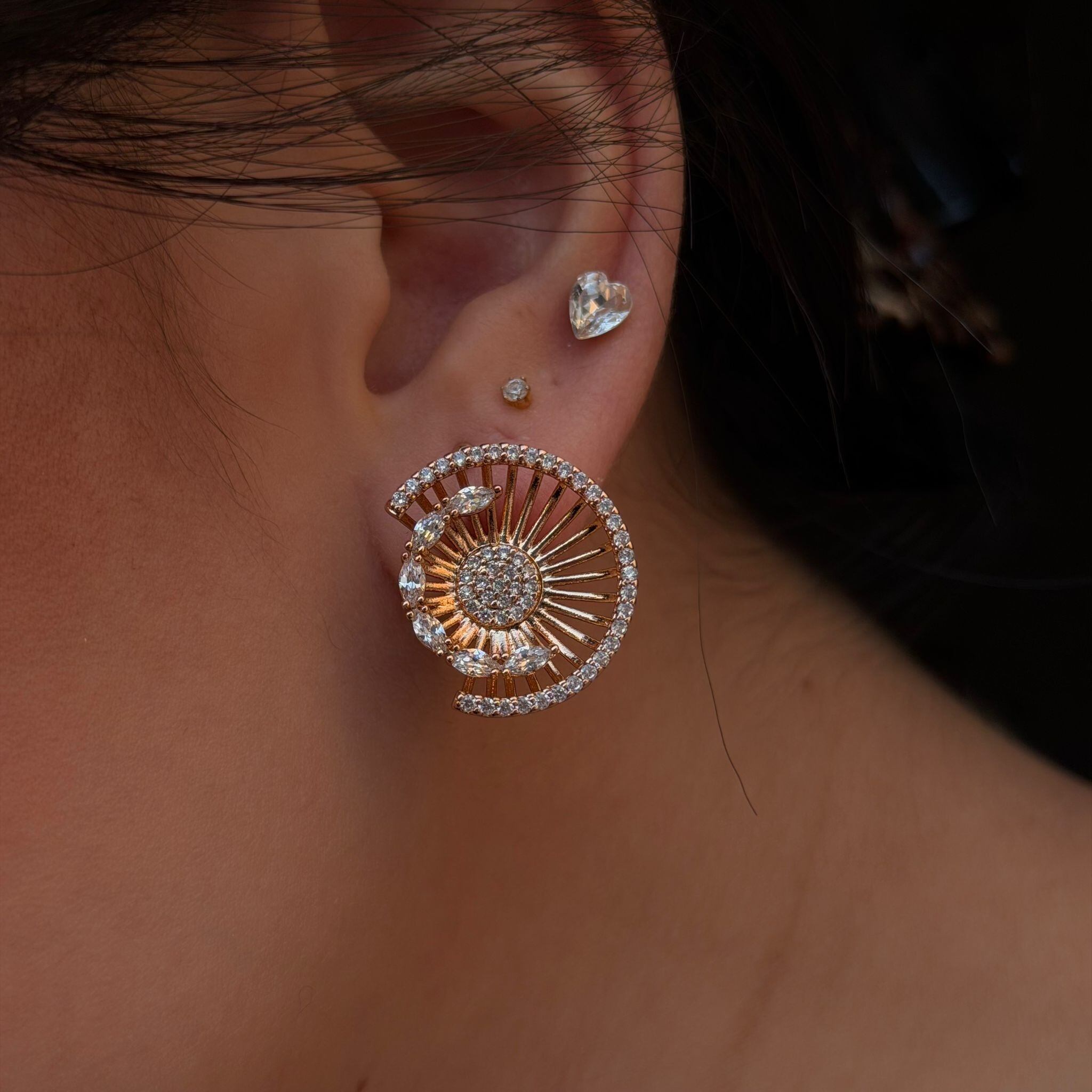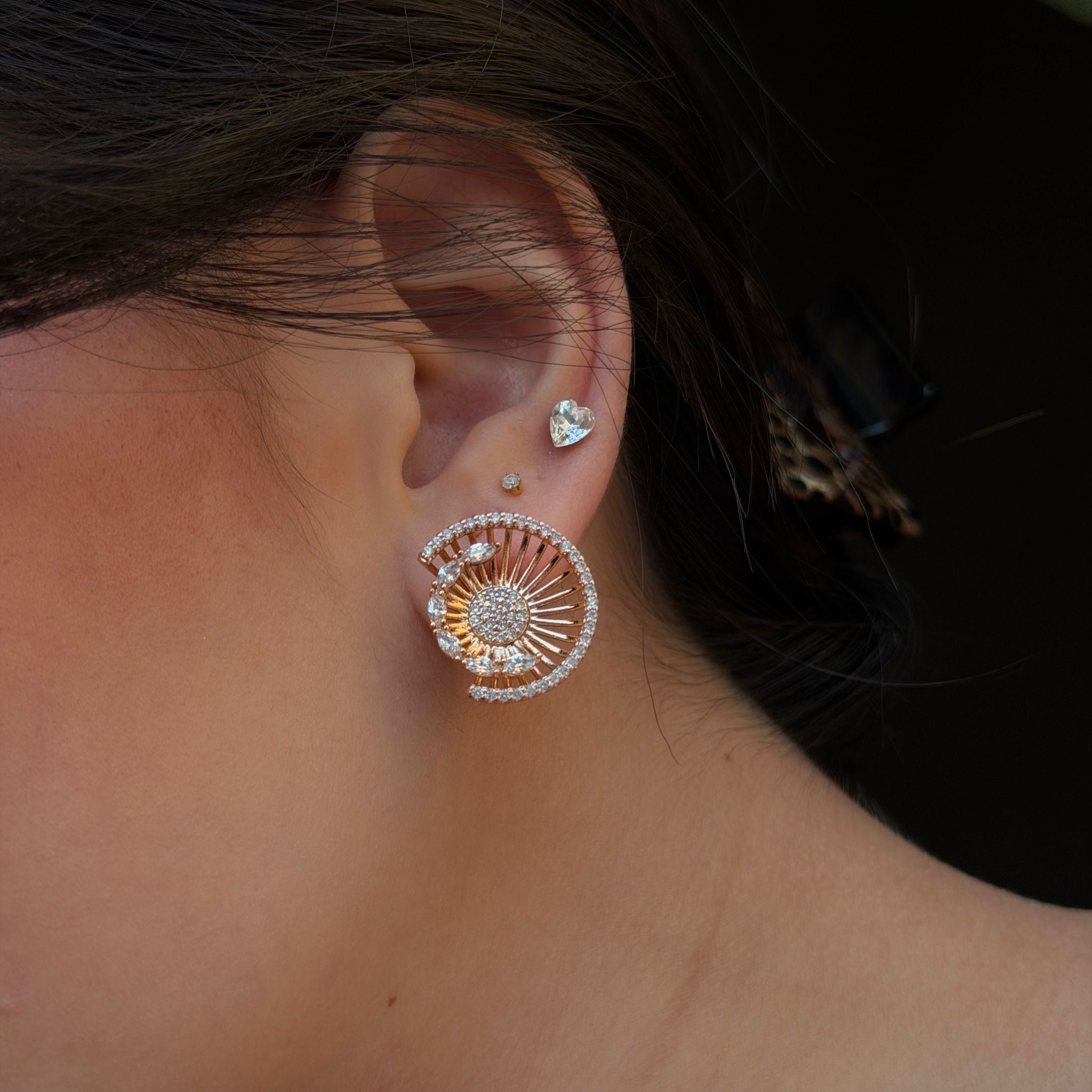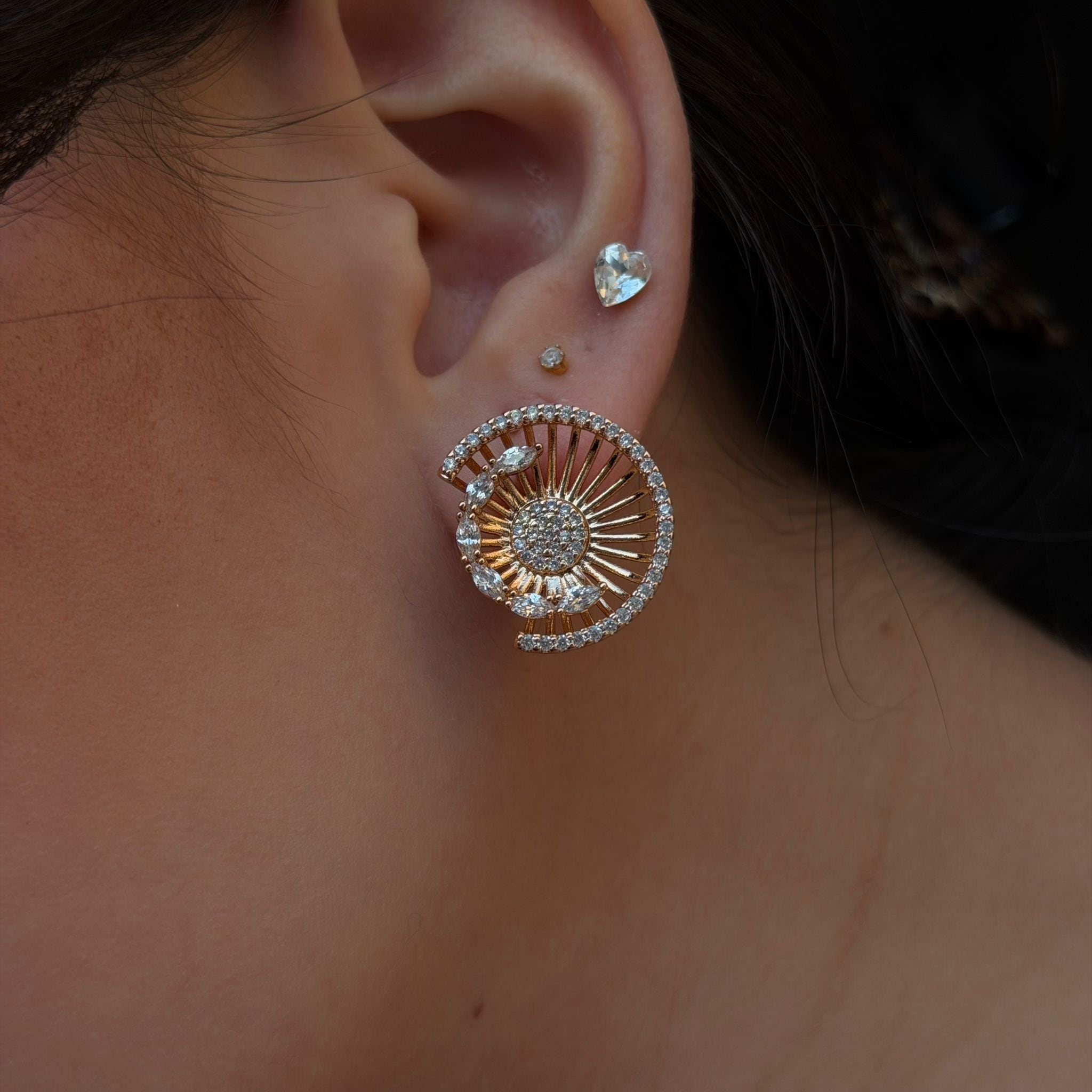 中心から広がる輝きが耳元を華やかに照らし、上品で存在感のある印象を与えます。