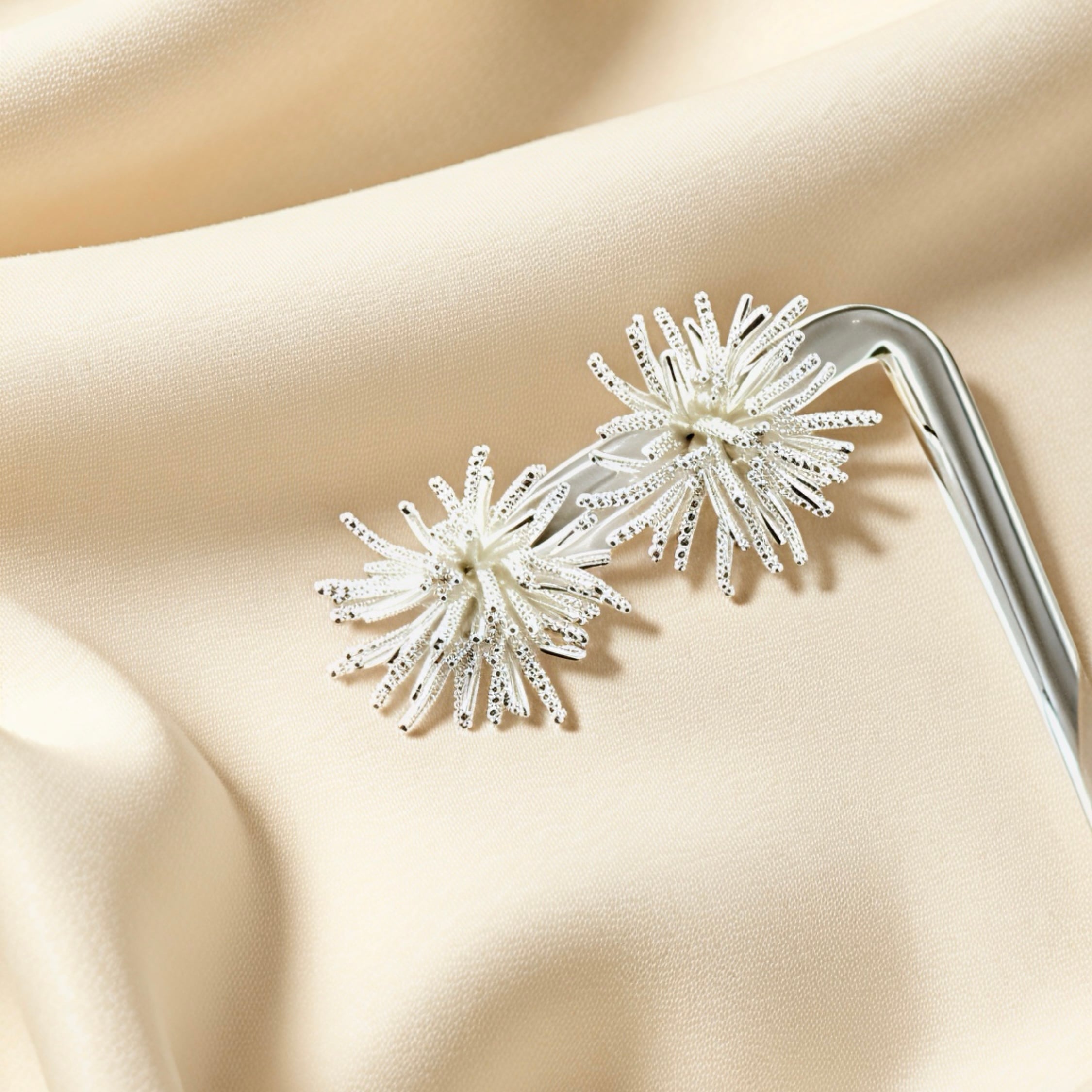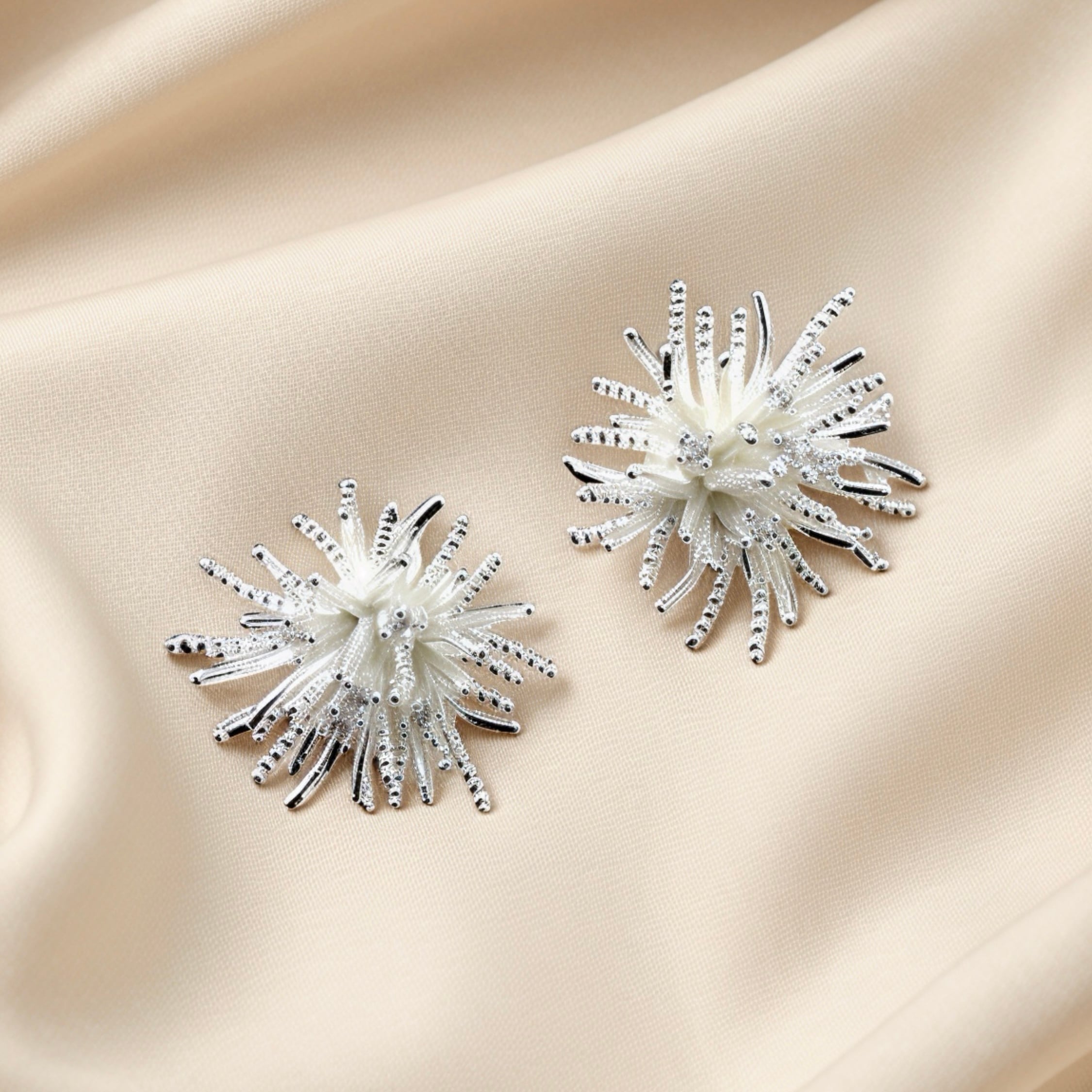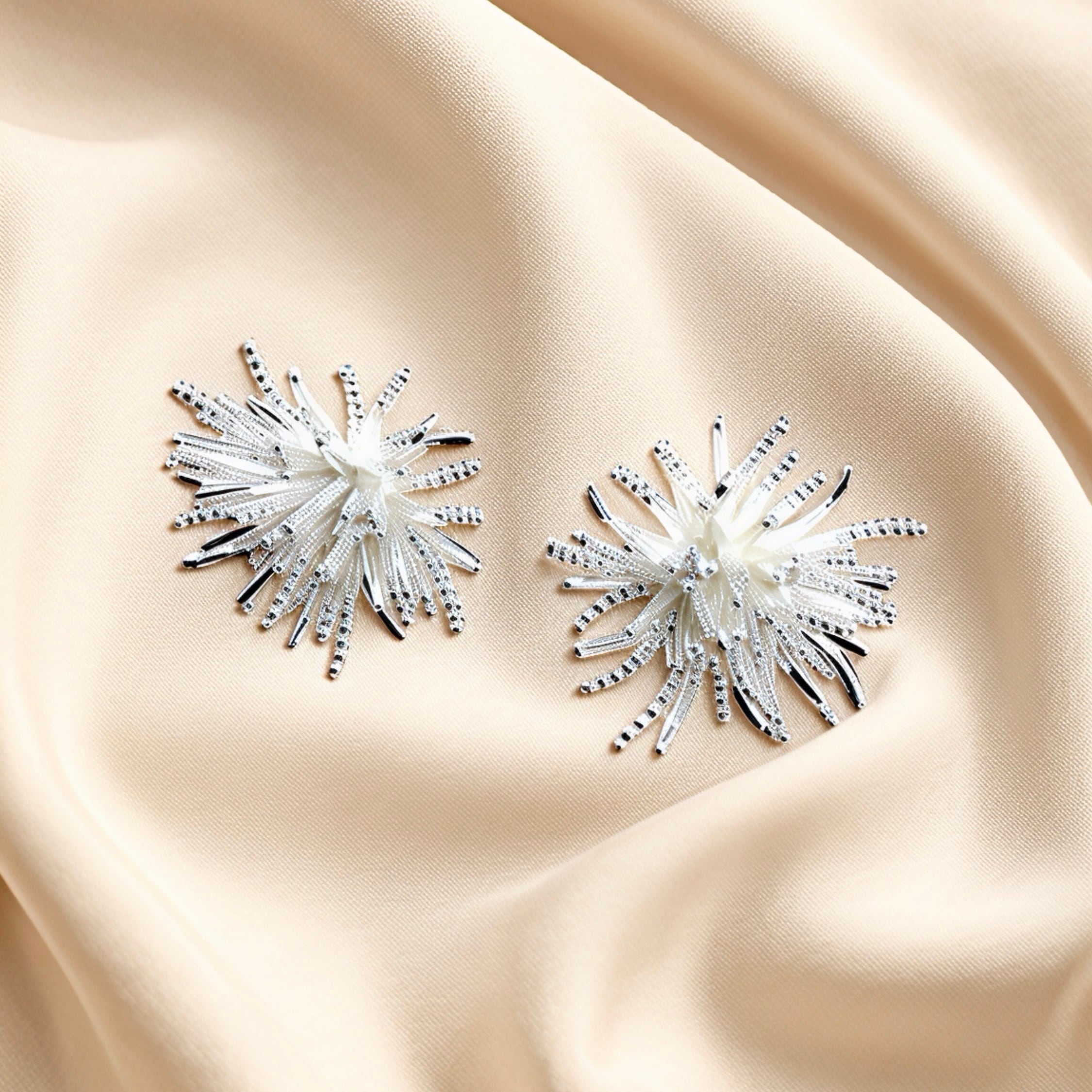 花火のように放射状に広がるデザインが印象的な、ロジウムコーティングのキャッチピアス。